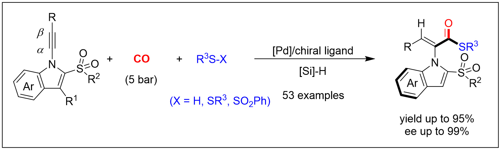 轴手性阻转异构体是众多天然产物、合成材料、药物分子的核心骨架,并作为手性催化剂及配体广泛应用于不对称催化领域。羰基化反应因其原子经济性高、应用范围广而备受关注。其中,炔烃的氢酯化反应是构建不饱和羰基衍生物的重要手段,硫酯化合物作为一类不饱和羰基衍生物中,在生命过程中具有关键作用。但是,在氢酯化反应中,当以硫醇作为亲核试剂时面临具有刺激性气味、催化剂易失活等问题,增加了炔烃羰基化的难度。