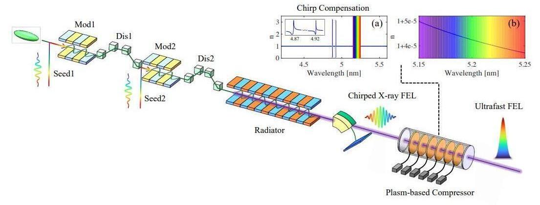 近日,我所化学反应动力学全国重点实验室大连光源科学研究室张未卿研究员团队与深圳先进光源研究院科研团队合作,在超快软X射线自由电子激光(FEL)领域取得新进展。研发团队提出一种基于等离子体的高效啁啾脉冲压缩方法,从理论和模拟层面证明了该方法可突破传统技术的效率瓶颈,为实现超高亮度的软X射线激光超短脉冲输出提供了新路径。