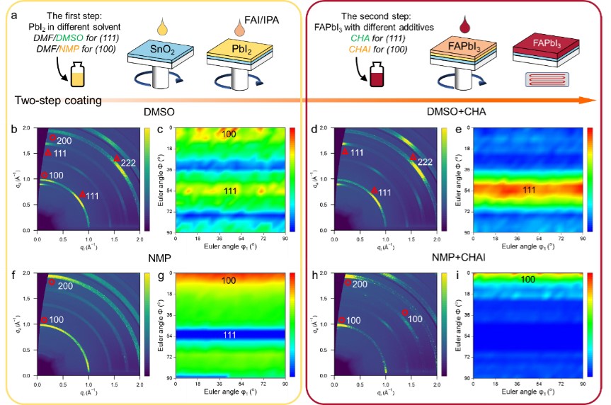 研究表明,溶剂体系在结晶前期通过形成特定的中间相结构,为晶体生长提供了初始取向模板。其中,DMF/DMSO体系倾向于生成与(111)晶面匹配的PbI₂·DMSO络合物,而DMF/NMP体系则更易形成与(100)晶面对应的PbI₂·(DMF/NMP)复合相。在此基础上,团队引入环己胺(CHA)和环己胺碘化物(CHAI)等添加剂,通过其在晶面的选择性吸附或化学反应,进一步调控晶面生长速率,从而实现了晶面取向从混合到单一化的精准调控。