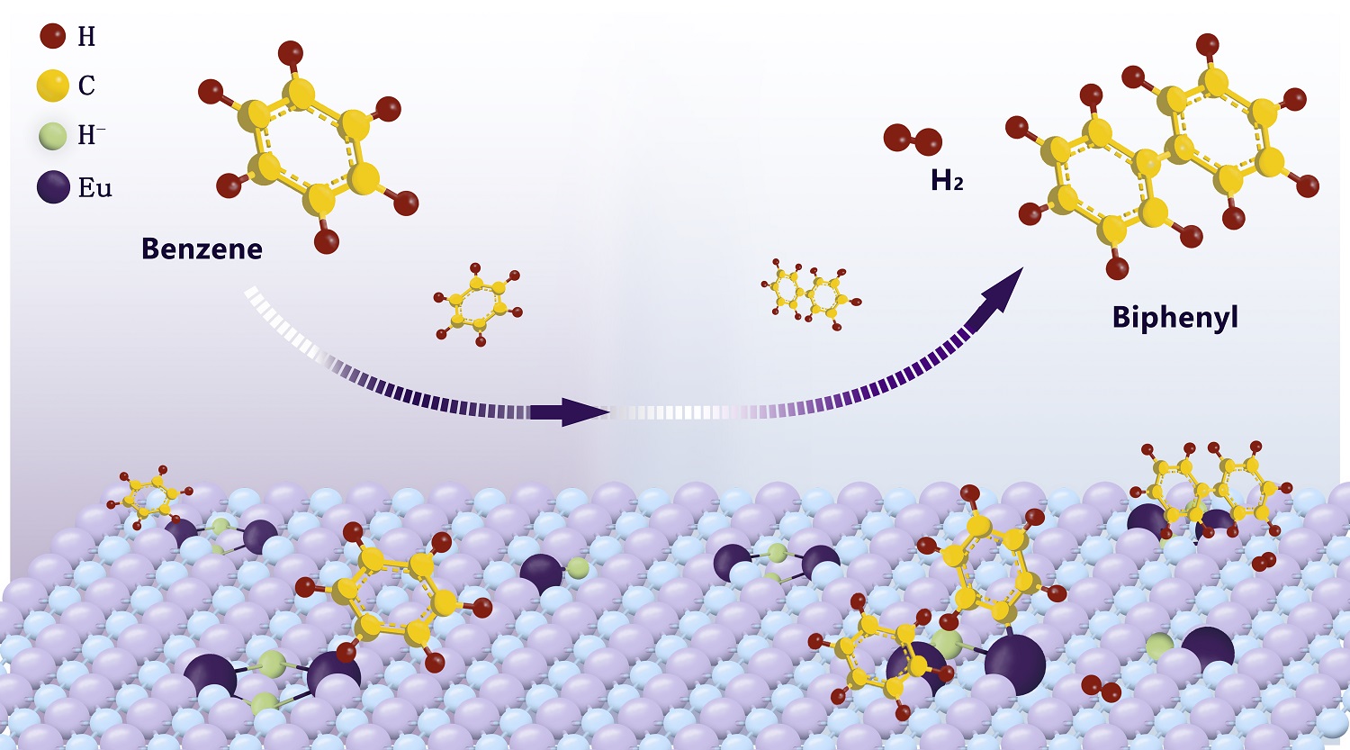 近日,我所氢化物能源化学研究中心(DNL1901组群)陈萍研究员、郭建平研究员团队与华中师范大学饶立副教授合作,开发出一种具有亚纳米结构的负载氢化铕催化剂,该催化剂在温和、非氧化条件下,实现了苯直接脱氢偶联制备联苯的催化过程。该研究揭示了氢化物在惰性碳-氢(C-H)键活化中的独特作用机制,为绿色高效构筑碳-碳(C-C)键提供了新途径。