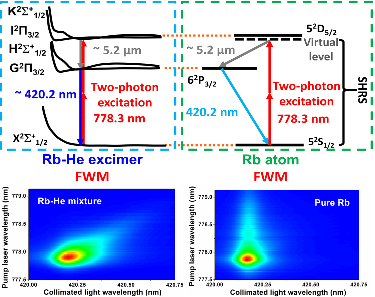在本工作中,该团队在前期高功率碱金属近红外激光研究的基础上,提出了基于铷-氦准分子的四波混频过程产生蓝光激光的新机制。团队利用约778 nm双光子激发,在满足能量守恒和动量守恒条件之后,按照X2Σ+1/2→K2Σ+1/2/I2Π3/2→H2Σ+1/2/G2Π3/2→X2Σ+1/2路径,产生约420 nm激光。研究发现,在纯铷蒸汽中,常规的铷原子四波混频产生的蓝光激光波长不变;而在准分子四波混频中,受势能曲线连续变化的影响,所产生的激光波长具有小范围的可调谐性。