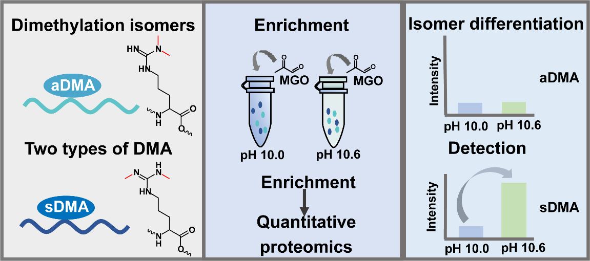 精氨酸二甲基化是蛋白质功能调控中一项重要的翻译后修饰,广泛参与基因转录、RNA剪接、DNA损伤应答等关键生物学过程。该修饰包括两种异构体——不对称型二甲基化(aDMA)和对称型二甲基化(sDMA)。尽管二者具有相同的化学式,却表现出不同甚至相反的生物学效应。因此,在开展深入生物学研究前,准确确定它们的具体结构至关重要。目前,常用的特异性抗体富集和中性丢失质谱法在应用中存在局限:前者实验成本高、特异性不足;后者受限于MS/MS谱图中信息化碎片离子产生的随机性。因此,精氨酸二甲基化分析方法在异构体区分方面仍然面临挑战,阻碍了精氨酸二甲基化的功能研究。
