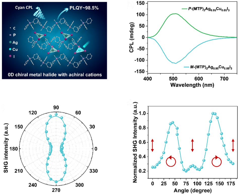 在本工作中,研究团队采用非手性甲基三苯基膦阳离子与三角形银-碘无机单元组装,构建出零维手性银卤化物。团队通过掺杂铜离子,不仅提升了材料的发光效率,还赋予其圆偏振发光活性,从而将金属卤化物的圆偏振发射拓展至青色区域。系统的光谱表征表明,铜掺杂不仅能有效抑制主体中的非辐射复合过程,还会引入新的铜相关发光中心,从而使材料的荧光量子产率接近100%,并获得1.3 × 10-2的发光不对称因子。此外,该手性体系的本征非中心对称结构,使其具备偏振敏感的二次谐波响应,并表现出显著的二次谐波圆二色性。本工作提出了一种无需依赖手性阳离子的金属卤化物手性光学调控策略,为设计兼具圆偏振发光活性与非线性光学响应的金属卤化物提供了新思路。