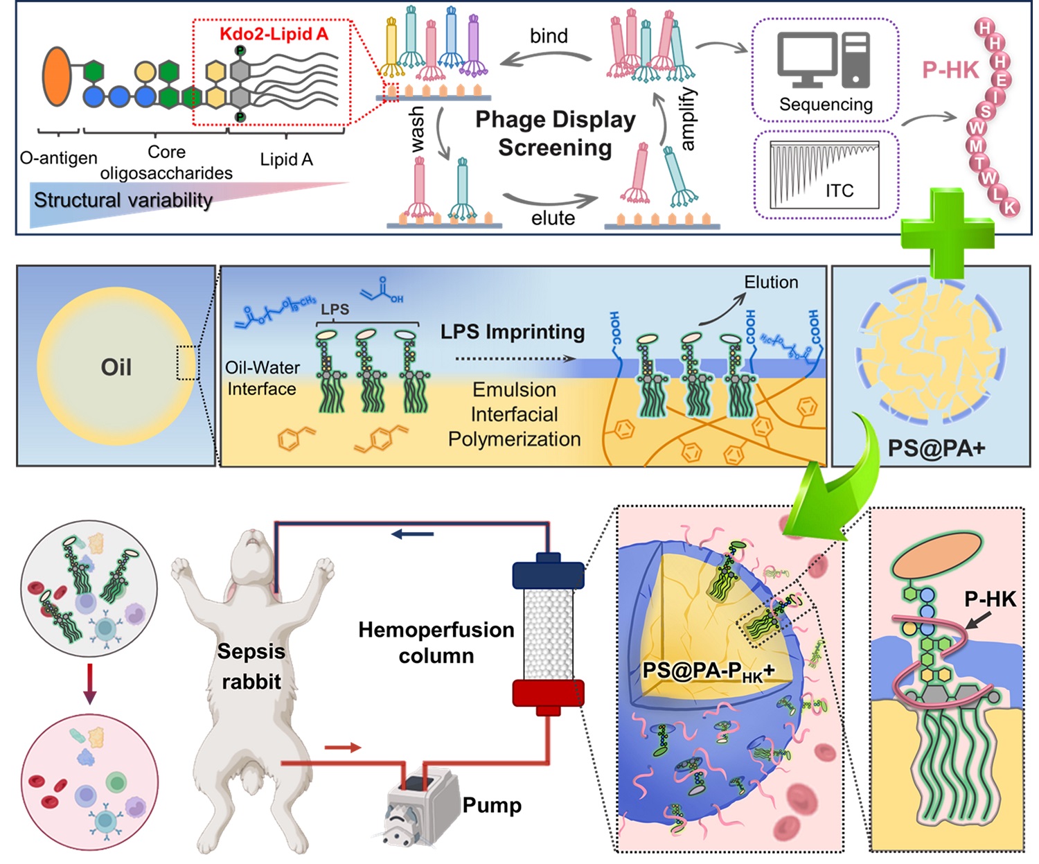 脓毒症是一种由感染引起的全身炎症反应的疾病,致死率高,治疗成本高昂,是临床面临的一大挑战。脂多糖(又称内毒素)作为脓毒症的核心致病因子,在疾病早期及时清除对于阻断病情恶化、挽救患者生命至关重要。然而,由于脂多糖结构多样、血液中含量极低且血液成分复杂,实现其高效、高特异性清除一直是临床面临的挑战。