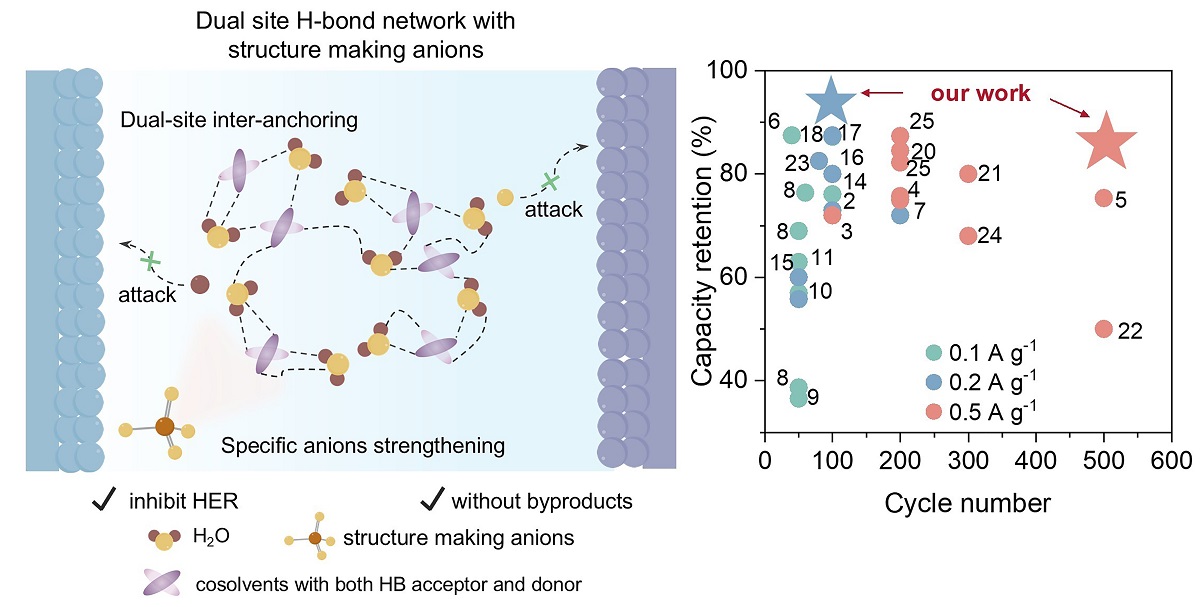 近日,我所无机膜与催化新材料研究组(504组)杨维慎研究员、朱凯月研究员团队在钒基水系锌离子电池研究中取得新进展。团队通过在电解液中构建互锁型强氢键网络,有效降低了水溶剂中氧和氢的反应活性,从而抑制了正负电极的腐蚀。