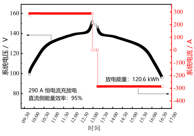 近日,我所储能技术研究部(DNL17)李先锋研究员、郑琼研究员团队开发出100 kWh级磷酸盐基钠离子电池储能系统,并在山东滨州临港化工产业园区实现并网运行。该系统由1000余只36 Ah方壳电芯集成的28个模组,以及配套的电力控制模块组成。经现场测试,在290 A恒流条件下,该系统放电能量为120.6 kWh,直流侧能量转化效率超过95%。该系统部署在滨化集团碳三碳四综合利用项目中,与充电桩共同构成了“光-储-充”体系,在白天光伏大发时段可将余电储存,晚间用电高峰时段释放,避免因电网消纳能力不足导致的弃光,实现削峰填谷,降低用电成本。