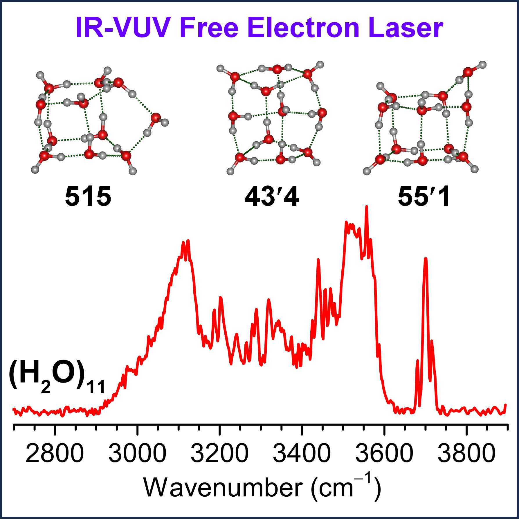 近日,我所化学反应动力学全国重点实验室团簇光谱与动力学研究组(2506组)江凌研究员、李刚副研究员实验团队联合清华大学李隽院士理论团队,利用自主研制的基于大连相干光源的中性团簇红外光谱实验站,表征了水分子十一聚体团簇的三种结构模型(515、43′4和55′1),为理解水的复杂氢键网络结构演化机制提供了新的科学依据。