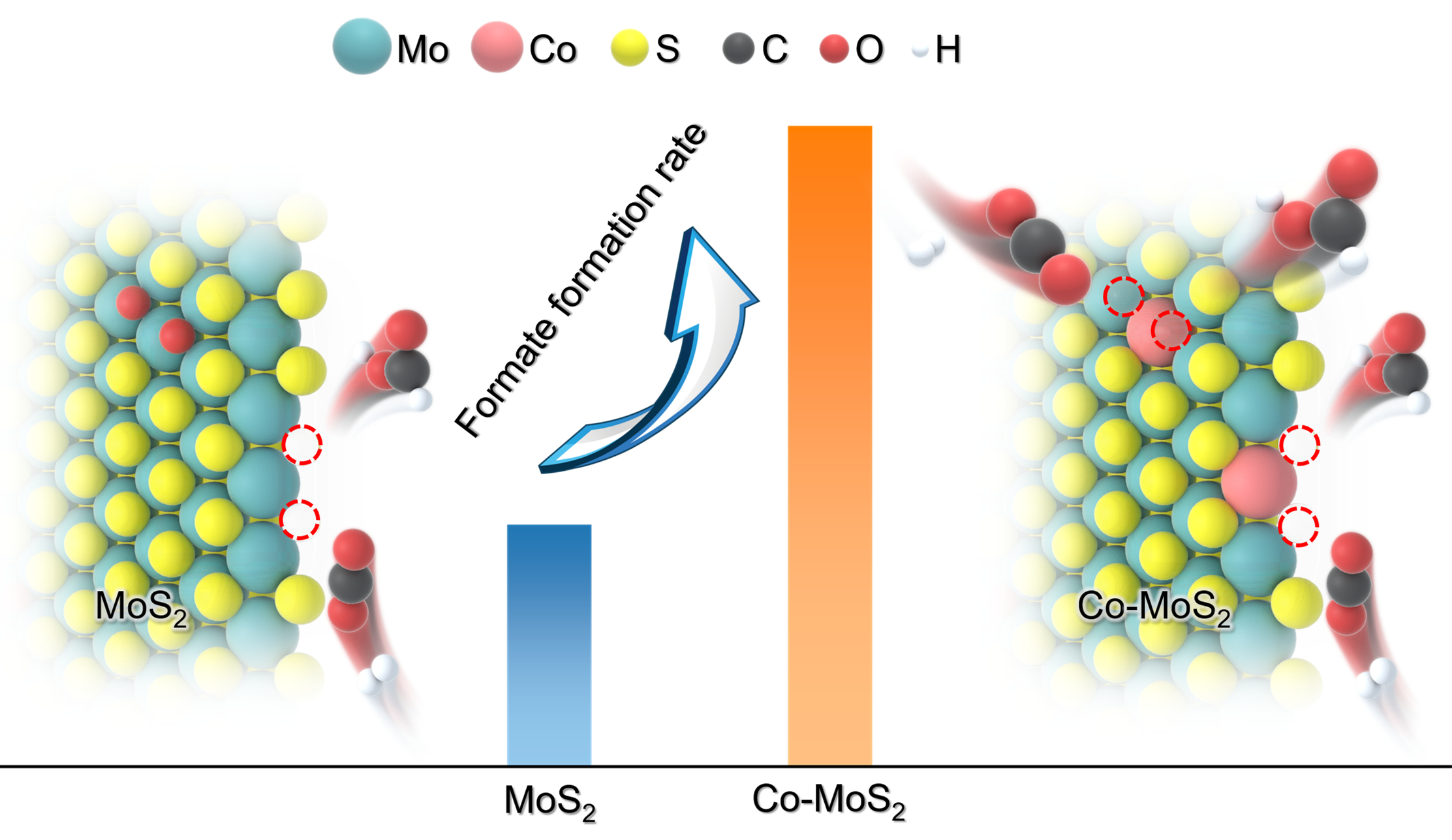 基于此,本工作中邓德会团队通过晶格限域杂原子实现了二维硫化钼硫空位限域金属中心活性的调控,发现将Co原子限域在二维硫化钼晶格中(Co-MoS2),可促进限域Co位点处硫空位的形成,从而在Co-MoS2催化剂上实现高效CO2加氢制甲酸盐。该催化剂在200 oC下,甲酸盐生成速率达到17.0 mmol gcat.-1 h-1,选择性超过99%,其反应速率为未修饰MoS2催化剂的三倍。结合多种实验表征和理论计算发现,Co比Mo具有更低的配位数,这导致晶格限域Co-Mo位点与表面硫或氧之间的键合作用较弱,从而促进了氢气(H2)驱动下的硫或氧物种的移除,生成硫空位。暴露出的硫空位限域Co-Mo位点,在边缘和面内都具有适中的CO2吸附能力,能够抑制C-O断裂并促进生成甲酸盐,从而使得Co-MoS2非贵金属催化剂在CO2加氢制甲酸盐反应中展现出优异的活性和选择性与良好的结构稳定性。