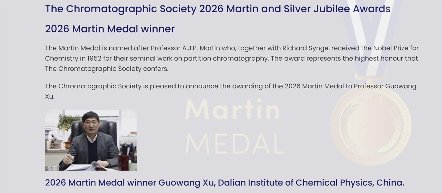 近日,英国色谱学会(The Chromatographic Society)在其官网宣布,我所许国旺研究员荣获2026年度马丁奖(Martin Medal),成为首位获得该奖项的中国学者。