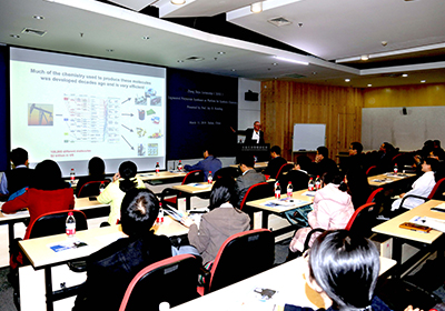 报告中,Keasling以化学品传统生产工艺面临化石资源短缺问题为切入点,重点介绍了其研究团队用聚酮合酶系统,合成特殊化学品的最新研究进展:Ⅰ型聚酮合酶由多个功能模块组成,Keasling团队组合不同来源的功能模块,设计新的聚酮合酶,拓展合成装配线的底物谱,合成了系列特殊化学品。报告现场气氛活跃,讨论积极。