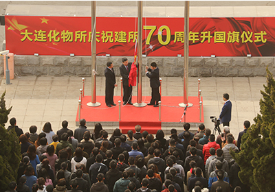 在庄严的国歌声中,全国五一劳动奖章获得者李灿院士、辽宁省先进工作者丁云杰研究员、大连市先进工作者赵宗保研究员将鲜艳的五星红旗冉冉升起。