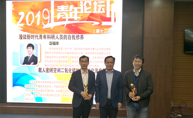 12月26日,由我所青年创新促进会(以下简称“青促会”)、所团委、所博士后联谊会共同举办的“大连化物所青年论坛”第十二讲在能源基础楼一楼会议室举行。本次论坛邀请了我所宽光谱捕光材料与光催化创新特区研究组(DNL16T2)章福祥研究员与特种能源催化过程研究组(1506组)黄延强研究员分别以“漫谈新时代青年科研人员的自我修养”和“载人密闭空间二氧化碳的催化转化及应用”为题作了报告。所党委副书记、纪委书记毛志远出席并为两位报告人颁发“大连化物所青年论坛”特制奖杯。论坛由所青促会理事长田文明主持。