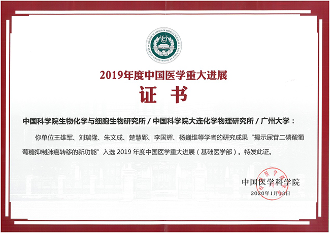 近日,中国医学科学院发布“2019年度中国医学重大进展”,我所李国辉研究员、楚慧郢副研究员,与中国科学院生物化学与细胞生物研究所杨巍维研究员、王雄军教授、刘瑞隆博士、朱文成合作的研究成果“揭示尿苷二磷酸葡萄糖抑制肺癌转移的新功能”入选2019年度中国医学重大进展(基础医学部)。