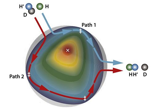 化学反应的进程伴随着复杂的量子力学现象,但其通常难以被直接观测到,因而化学反应的本质亦难以得到透彻的理解。我所杨学明院士、张东辉院士、孙志刚研究员和肖春雷研究员团队提供了一个研究范例。他们研究发现,在H+HD→H2+D反应中,在碰撞能量为1.9~2.2电子伏的范围内,产物H2(v=2,j=3)的后向散射呈现显著的振荡(其中v是振动量子数,j是转动量子数)。通过拓扑理论分析,他们发现该反应存在两条迥然不同的反应路径,振荡是由这两条路径之间的量子力学干涉所产生的。该研究揭示了该反应在较低能量处,量子几何相位效应仍然存在,并可以被观测到。这非常类似于众所周知的Aharonov-Bohm效应,清晰地揭示了化学反应的量子性。