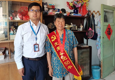 走访中,所领导亲手为老党员们佩戴上了“光荣在党50年”纪念章。当戴上金灿灿的纪念章那一刻,老党员们个个心潮澎湃、激动万分,荣誉感、归属感、使命感油然而生,他们感谢党和国家的关怀和认可,感谢我所一直以来的关爱和重视,并深感使命光荣、责任在肩,更加坚定了为党的事业奋斗终身的决心和动力。