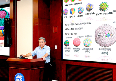 报告中,饶子和详细介绍了其在解析COVID-19病原体SARS-CoV-2的一系列工作,通过构建SARS-CoV-2巨大的蛋白质复合体,以结构生物学视角研究了SARS-CoV-2在宿主细胞中的复制等过程,为开发SARS-CoV-2抗病毒药物提供了思路。