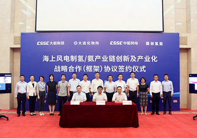 8月6日,我所与大连船舶重工集团有限公司(以下简称“大船集团”)、中国船舶集团风电发展有限公司(以下简称“中船风电”)、国创氢能科技有限公司(以下简称“国创氢能”)在大船集团签订了《海上风电制氢/氨产业链创新及产业化战略合作(框架)协议》。大船集团党委书记、董事长杨志忠与副总经理、总工程师郑炜,中船风电副总经理张晓阳,国创氢能总经理辛廷慧及各企业相关人员,大连市发改委工业处处长万九文,大连市科技局副局长蒋行海,大连市氢能产业发展促进协会会长任峰等,我所副所长李先锋、科研及职能部门相关人员以线下或线上形式参加签约仪式。签约仪式由大船集团高级顾问牛淑鸿主持。