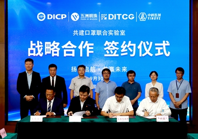 9月30日,我所与大连检验检测认证集团有限公司(以下简称“大检集团”)、大连海丽非织造布有限公司(以下简称“大连海丽”)、中科化物医用技术(大连)有限公司(以下简称“中科医用”)共建“口罩联合实验室”签约暨揭牌仪式在能源基础楼举行。大检集团党委副书记、董事梁冰晗,大连海丽董事长许海,中科医用执行董事杨学成及各企业相关人员,我所副所长李先锋、科研及职能部门相关人员参加活动。我所知识产权与成果转化处处长张晨、大检集团大连产品质量检验检测研究院有限公司总经理谢涛、许海、杨学成代表各方签署共建协议。李先锋、许海、梁冰晗、杨学成共同为口罩联合实验室揭牌。
