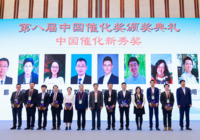 开幕式上还颁发了“第八届中国催化奖”。北京大学谢有畅教授获得“中国催化成就奖”(冠名“张大煜奖”);中国科学技术大学路军岭教授获得“中国催化青年奖”;厦门大学成康副教授、中国科学院上海高等研究院高鹏研究员、我所焦峰副研究员、浙江工业大学林丽利教授、中国科学技术大学刘进勋研究员、北京化工大学邵明飞教授、北京大学王蒙副研究员、天津大学王悦研究员、浙江大学吴勤明副研究员、四川大学余达刚教授获得“中国催化新秀奖”。谢有畅代表获奖者发表获奖感言并作了题为《自发单层分散理论:从基础研究到工业应用》的获奖报告。