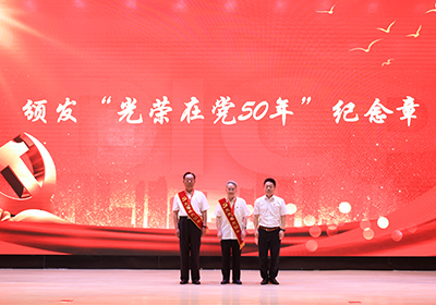 会上,举行2022年“光荣在党50年”纪念章颁发活动,金玉奇为白吉玲、王甲清两位老党员颁发、佩戴纪念章。