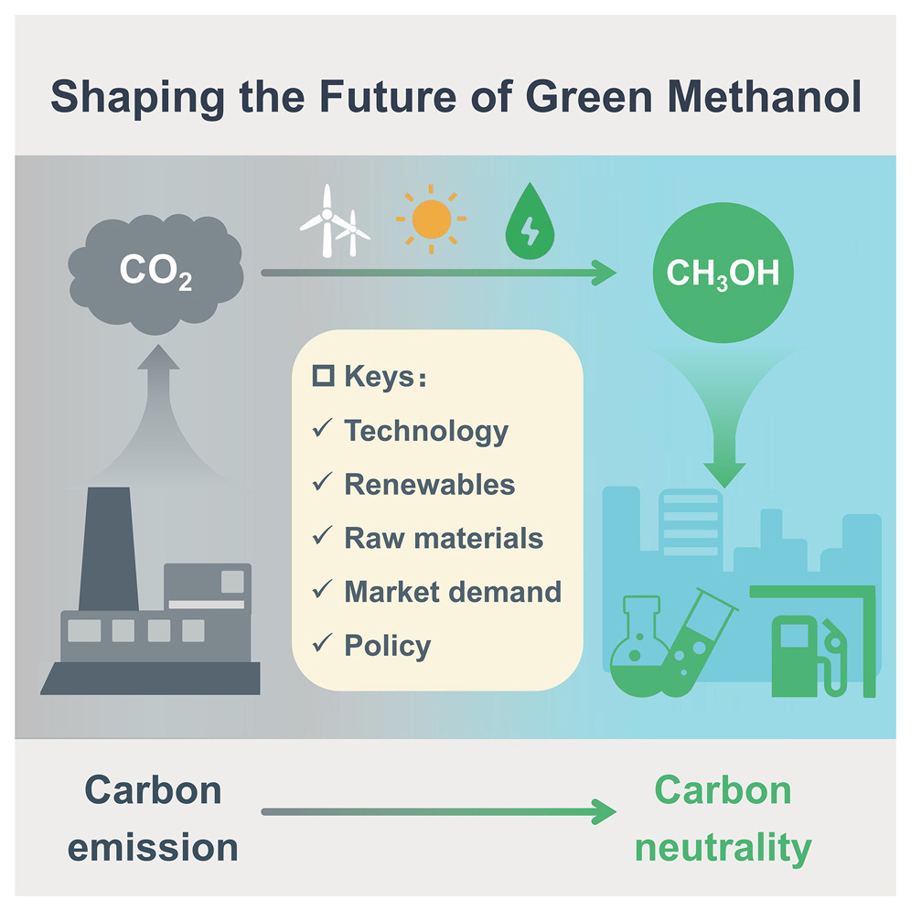 该评述针对绿色甲醇概念界定、CO2与氢气(H2)来源、催化剂与工艺开发,以及经济性评估等关键维度,系统梳理了CO2加氢制甲醇技术从过去、现在到未来的发展脉络。该评述强调,实现绿色甲醇的经济可行性与环境可持续性,需要开发更高活性、选择性和稳定性的催化材料,设计高效的反应器以强化传热传质,并优化整个工艺流程及最大化能量利用效率;同时,应该将技术创新与获取低成本可再生能源和可持续碳源相结合,从源头上降低生产成本和碳足迹。该评述旨在激发领域内的批判性思考与创新性研究,为加速绿色甲醇合成技术从实验室走向产业化提供科学指导。