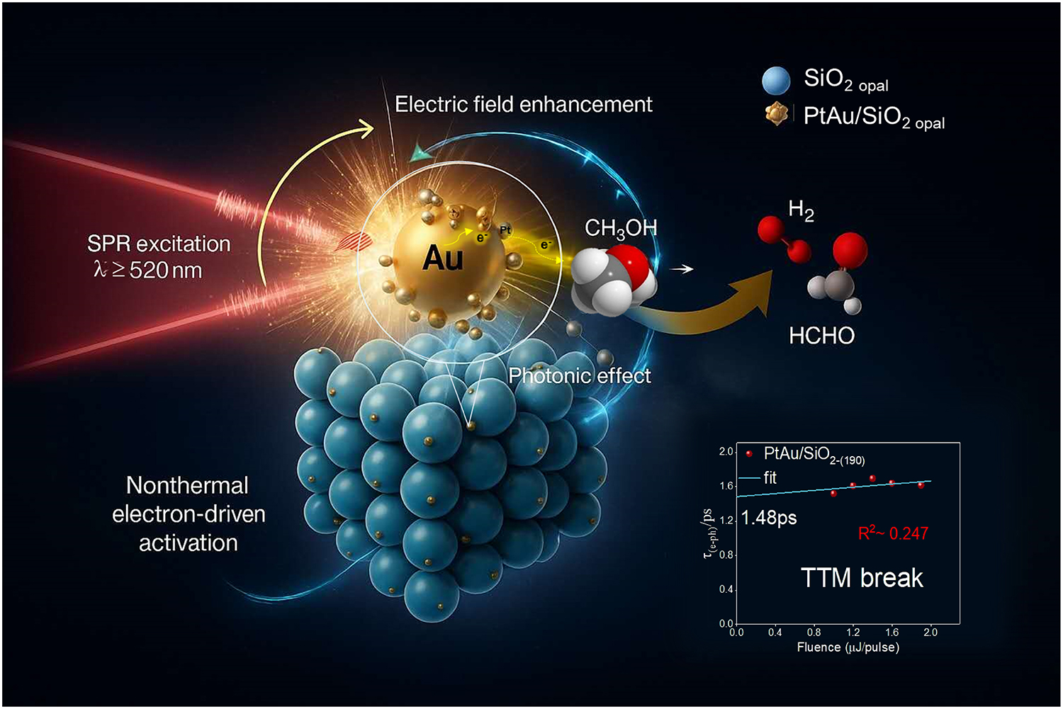 在此基础上,本工作创新性地将光子晶体与等离激元结合,利用有限元模拟指导材料设计,构筑了PtAu/SiO2光子晶体催化剂。团队发现,在SiO2光子晶体中引入部分光子带隙,可基于慢光子效应调控光的传导;同时,Au纳米颗粒使光子晶体形成缺陷,使光强在光子晶体中产生局部增强。该方法突破了常规等离激元受限于光激发产生热电子、热电子再传热给晶格的双温模型,实现了光子和等离激元量子效应耦合所引入的非热载流子路径主导反应过程。进一步,团队通过提升局域光生载流子浓度,实现了载流子从Au到Pt的有效注入,并在Pt催化剂上完成了高效催化反应,将甲醛产率提高了45倍,且选择性超过99.8%。