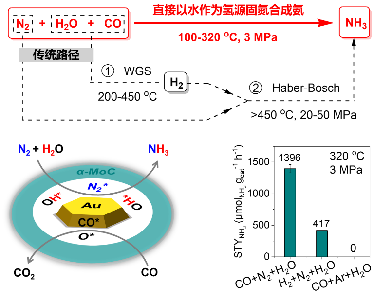 邓德会团队长期致力于能源与环境小分子的催化转化研究,前期在氮气、水等惰性小分子催化转化方面取得了系列进展(Nat. Catal.,2023;Nat. Catal.,2023;Nat. Synth.,2023;Nat. Catal.,2021;Nat. Commun.,2021;Nat. Commun.,2019)。本工作针对上述挑战,提出了系统性的解决方案。在热力学层面,团队创新性地引入一氧化碳(CO)调变热力学,利用其与水中氧原子反应的强放热,将原本强吸热的反应转变为热力学有利反应,从而绕开氮气与水反应的热力学限制。在动力学层面,团队设计并构建了Au/α-MoC1-x双位点催化剂,其界面钼(Mo)位点负责吸附活化氮气(N2)和水(H2O)生成氨,界面金(Au)位点则吸附CO作为“氧受体”移除残余氧,二者协同实现了氮气活化、水分解、加氢与氧移除等多个步骤的相互拉动与催化循环。该“反应耦合”与“双位点协同”相结合的策略使得原本不可行的反应在100 °C的低温下即可启动,在320 °C时产氨速率达1396 μmol g-1 h-1,其性能较相同条件下利用氢气作为氢源的体系高出2倍以上。该工作不仅证实了温和反应条件下氮气和水直接合成氨的可行性,更在原理上为开发其他直接用水作为氢源的高效催化加氢过程提供了借鉴。