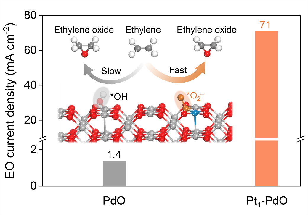 环氧乙烷是一种重要的化工中间体,工业上主要通过在较高温度(230至270 °C)和压力(1至3 MPa)下乙烯和氧气的反应来制备,该工艺存在转化率和选择性有限、能耗高、碳排放大等问题。直接电催化乙烯环氧化利用可再生电能驱动且以水作为唯一氧化剂,是一条绿色、低碳的环氧乙烷生产路线。但该过程面临着典型的活性—选择性跷跷板效应问题:活性氧物种的氧化能力过强会导致过度氧化生成二氧化碳,而氧化能力不足则难以高效活化和转化乙烯。
