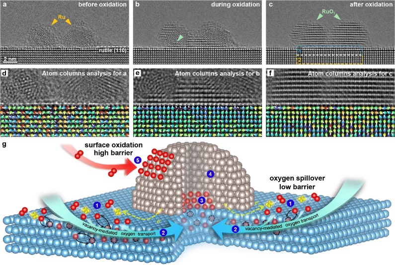 在本研究中,研究团队聚焦高性能负载型钌(Ru)基催化剂的研发,利用原子分辨环境透射电镜,从原子尺度原位解析了负载于金红石型二氧化钛上Ru单颗粒(Ru/TiO2)的氧化机制,并首次在该过程中观测到体相氧溢流,证实了载体中的晶格氧以空位介导的方式,通过金属/载体内部界面(interior interface)输运至金属颗粒。此外,团队还建立了皮米精度原子应变矢量分析方法,高分辨定量解析了氧溢流的行为,并追踪到界面持续氧输运所引发的载体局域晶格动态应变,进而揭示了金属/载体界面对体相氧溢流的调控作用,阐明了界面结构适配是体相氧溢流通道畅通的保障。该机制被证实广泛存在于氧化物相低晶格失配度的金属/载体界面催化剂体系,并在催化反应中发挥关键作用。