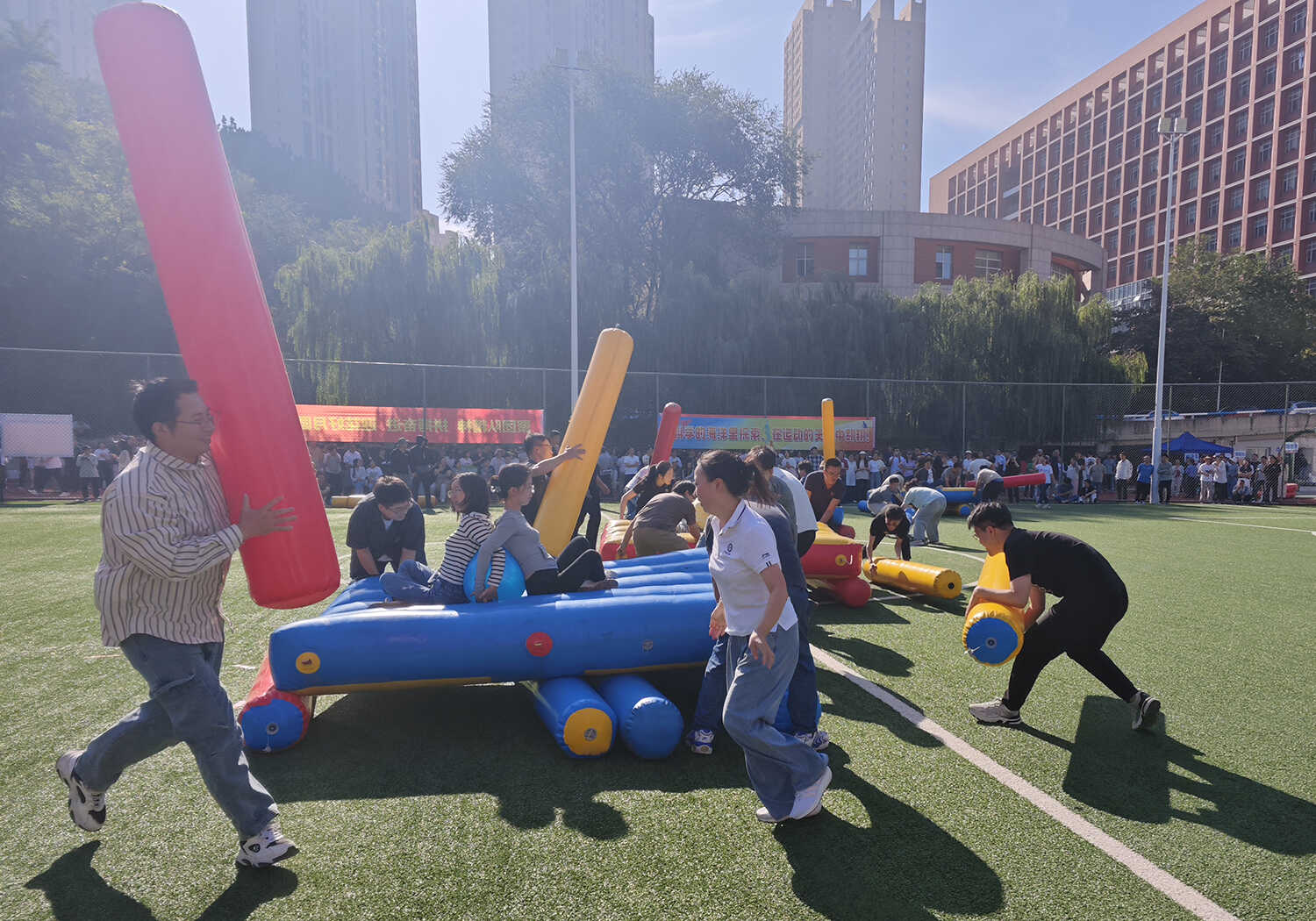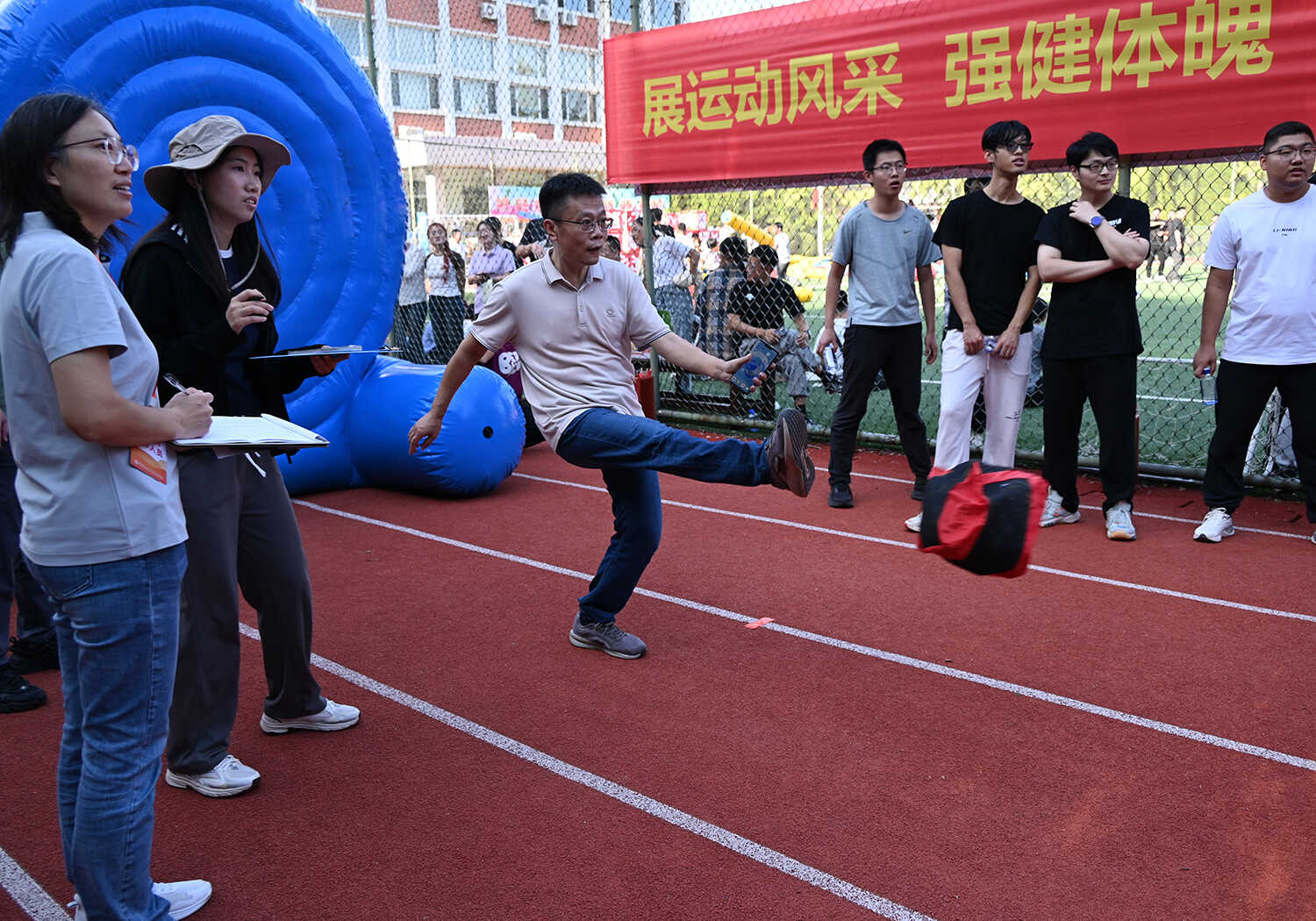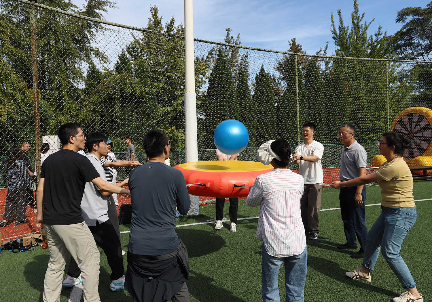 赛事活动分别在A、B两个场地同时火热开赛,其中A场地以团体赛为主,B场地以个人赛为主。本次活动精心设置了集竞技性、协作性与趣味性于一体的“齐心协力”“开心麻花”等9个项目,吸引了19支队伍(联队)参与,涵盖科研、职能部门的老中青职工和研究生。赛场上,运动员们全情投入,团结协作,为团队荣誉奋力拼搏;赛场边,观众们的加油声、欢呼声、笑声此起彼伏,整个运动场沉浸在一片欢乐、热烈、奋进的海洋中。经过半天的激烈角逐,各项赛事圆满结束。