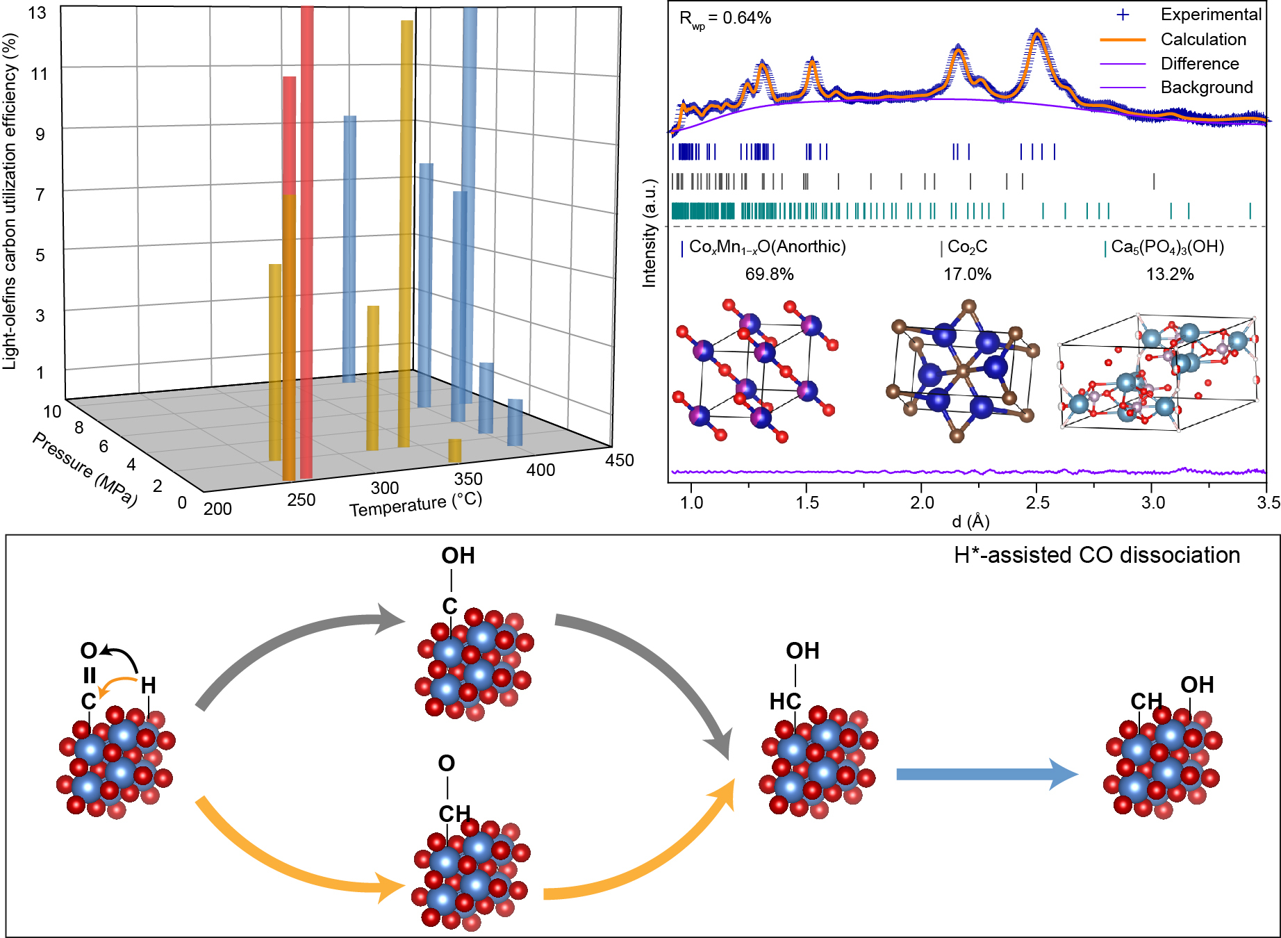 为解决上述问题,本研究围绕碳氧键高效活化与碳碳偶联协同匹配这一核心科学问题,从催化剂表面微观反应机制出发,发现引入特定亲水羟基助剂能够对一氧化碳活化产生积极影响,为理解和调控合成气转化反应提供了新的视角。研究发现,在钠-钴-锰催化体系中引入特定羟基助剂,例如羟基磷灰石、勃姆石和气相二氧化硅,可以构建富含表面羟基的反应界面,诱导形成具有低对称性三斜相结构的钴锰复合氧化物新催化位点,有利于促进H辅助的CO解离活化路径,进而提高CO的活化效率。在250至260°C、0.1 MPa的温和条件下,该催化体系可实现80%的CO转化率、60%的低碳烯烃选择性和超过80%的总烯烃选择性,并适用于较宽的氢碳比范围(H2/CO=1至2)。结构表征与机理研究表明,羟基助剂能够抑制催化剂的过度还原和碳化,稳定活性氧化物相,从源头上优化 CO 活化与C–C偶联之间的协同关系。该发现为理解CO/CO2催化转化过程中多相活性结构的动态演化提供了新的实验依据。