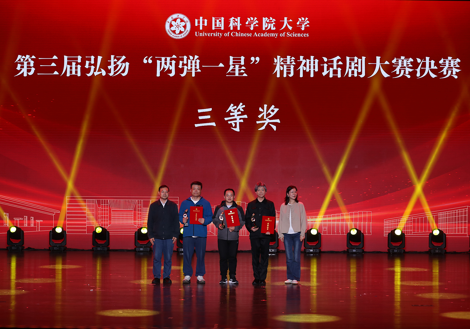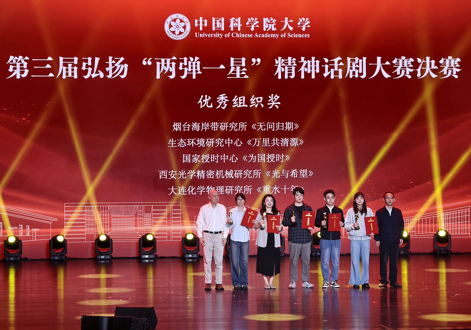 4月25日晚,中国科学院大学第三届弘扬“两弹一星”精神话剧大赛决赛在雁栖湖校区东区礼堂举行。中国科学院大学党委书记、校长周琪,“两弹一星”元勋陈芳允院士之子陈晓东,“两弹一星”攻关科学家张存浩院士之子张捷,中国科学院大学外语系教授李佩侄子李躍出席活动。经激烈角逐,我所选送作品《重水十年》荣获三等奖,同时获评“优秀组织奖”。